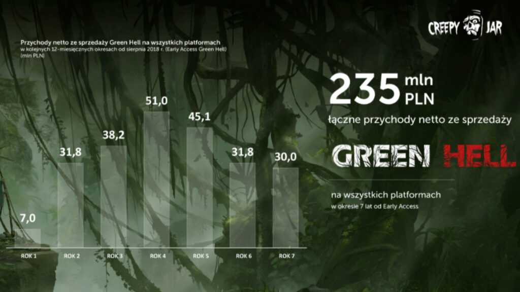 Dotychczasowe łączne przychody netto Creepy Jar S.A. z tego IP od rozpoczęcia sprzedaży do końca lipca 2025 r. wyniosły 235 mln PLN, przy łącznych bezpośrednich nakładach na produkcję i rozwój tytułu w wysokości ok. 21,4 mln PLN (w okresie od rozpoczęcia produkcji do 31 lipca 2025 r.).